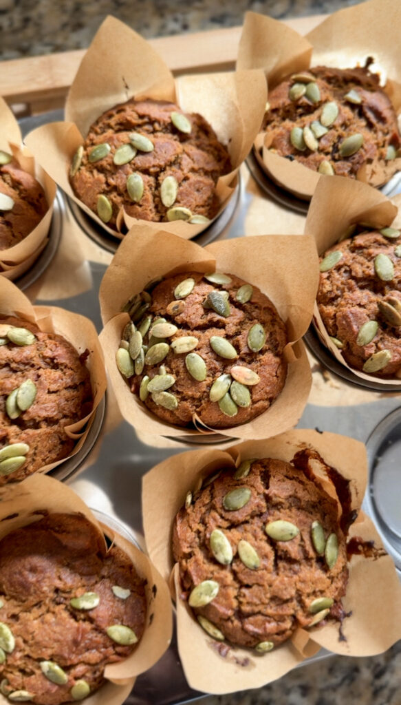 We cook together often, but this morning felt different. I was mostly hands-off, which is rare. Maybe it’s because we were baking one of our tried-and-true favorites: these gluten-free, dairy-free, refined sugar-free pumpkin muffins—our very own copycat Starbucks version.
